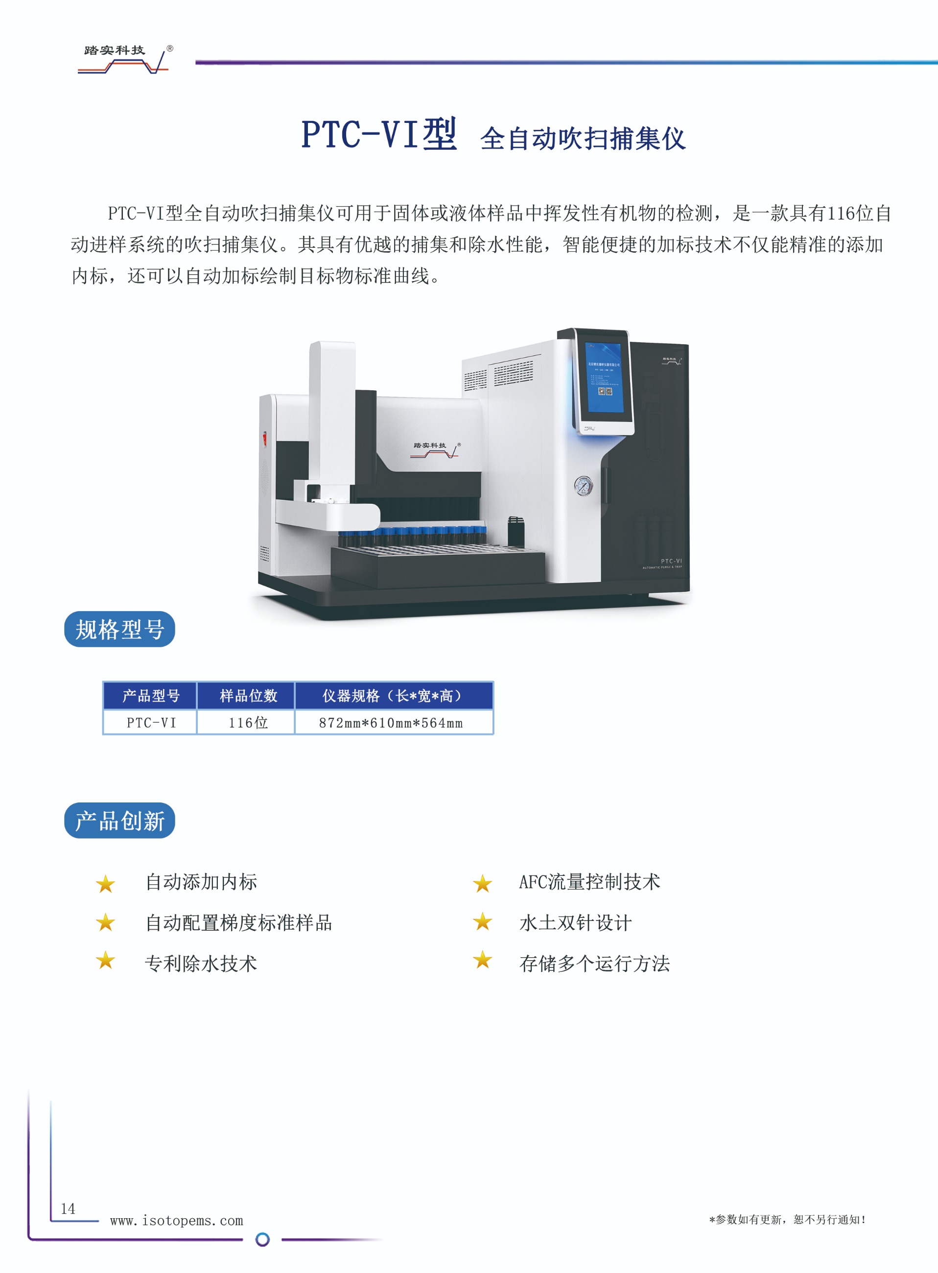 PTC-VI型全自動(dòng)吹掃捕集儀可用于固體或液體樣品中揮發(fā)性有機(jī)物的檢測(cè),是一款具有116位自動(dòng)進(jìn)樣系統(tǒng)的吹掃捕集儀。其具有優(yōu)越的捕集和除水性能,智能便捷的加標(biāo)技術(shù)不僅能精準(zhǔn)的添加內(nèi)標(biāo),還可以自動(dòng)加標(biāo)繪制目標(biāo)物標(biāo)準(zhǔn)曲線。通過(guò)與GC或GC-MS的聯(lián)用,可以廣泛應(yīng)用于環(huán)境分析,如飲用水、廢水、土壤中的有機(jī)污染物分析,也可用于食品中揮發(fā)物(如氣味成分)的分析等。該款儀器符合《HJ639-2012水質(zhì) 揮發(fā)性有機(jī)物的測(cè)定 吹掃捕集/氣相色譜-質(zhì)譜法》、《HJ686-2014水質(zhì) 揮發(fā)性有機(jī)物的測(cè)定 吹掃捕集/氣相色譜-質(zhì)譜法》、《HJ605-2011土壤和沉積物揮發(fā)性有機(jī)物的測(cè)定 吹掃捕集/氣相色譜-質(zhì)譜法》等標(biāo)準(zhǔn)。